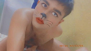 "Femboy masturbates in cat face makeup"