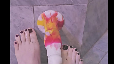 "Femboy gives barefoot and bare-legged footjob to dildo"