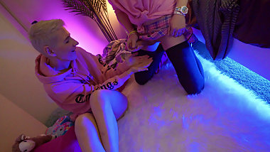 "Femboy jerk off in front of girlfriend and cums on her hand"