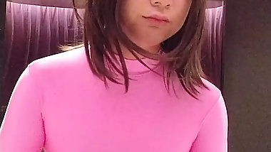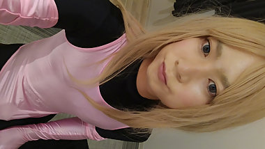 "A cross-dressing boy changes from a black leotard dress to pink full-body tights and masturbates"
