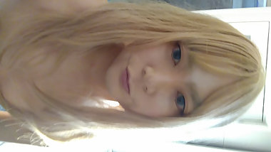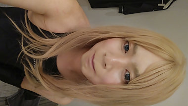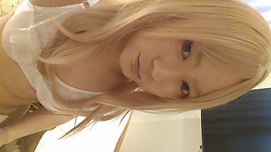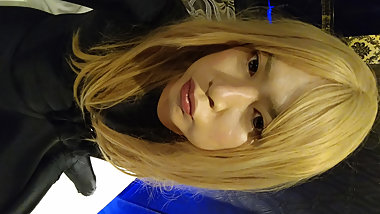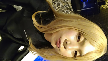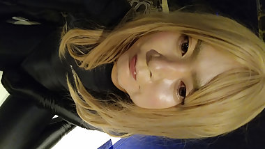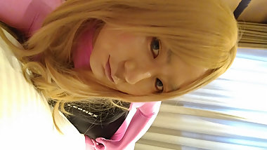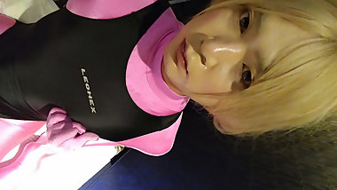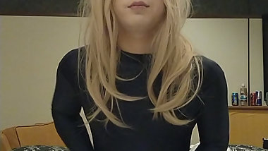 "A blonde cross-dresser changed from a cute dress to pink full-body tights and masturbated!"
