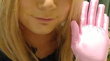 "A cross-dressing boy wearing a white wedding dress masturbated comfortably while touching his dick with pink gloves."