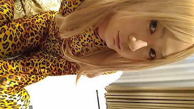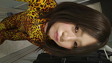 "A cross-dressing boy in a tight suit transformed into a leopard print full-body tights and masturbated."