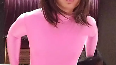 "A cross-dressing boy in pink full-body tights masturbated while feeling it with his nipples."