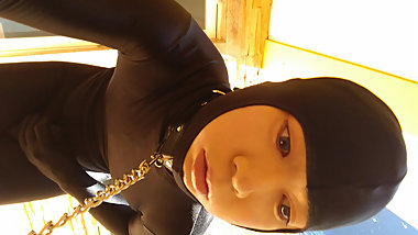 "A cross-dressing boy in black full-body tights with a collar begins to take off and masturbates in his underwear."