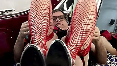 "Sasha Earth, sissy in black stockings has sex on the bed, fucks her ass with sex toy, dildo anal stretching, prostate ma"
