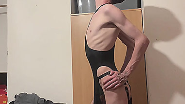 "HunterChase shows off his very skinny perfect body and his small ass in a black dress"