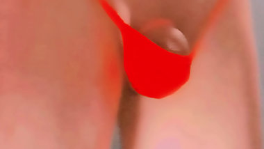 "Hot Very skinny male in a red lingerie stretched out his small ass on the bed"