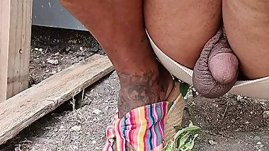 "Caged tiny clitty sissy shemale pissing outdoor and walking while pissing"
