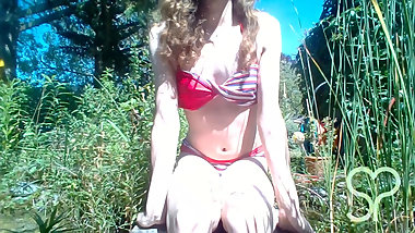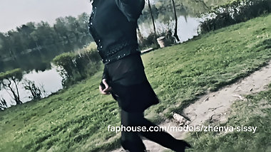 "Sissy outdoors walk with an anal fox tail and then fucked by her girlfriend with a strap-on"
