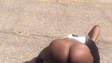 "Exhibitionist transgirl walks naked on the public beach and masturbates her big dick"