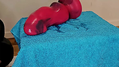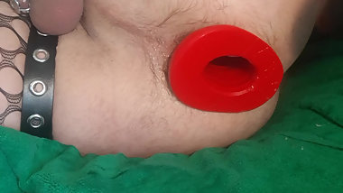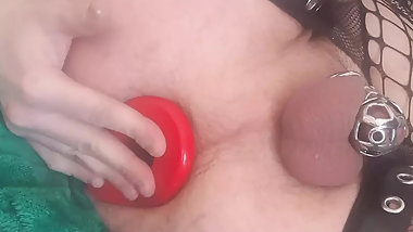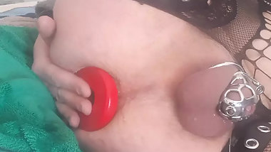 "Chastity Sissy Gaping on Huge Dildos and Leaking"