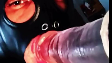 "Sissy sucks big dildo in pink mask"