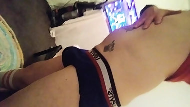 "SKINNY FEMBOY SHOWING HIS ASS WEARING LONG THIGH HIGH SOCKS"