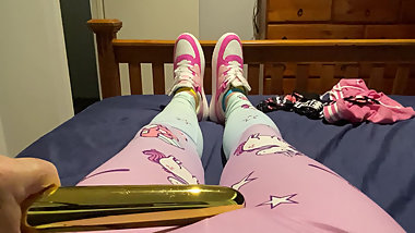 "KinkyChrisX in pink thigh highs socks playing with a pink double dildo"