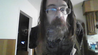 "Voyeur view of big dick crossdressing bear cumming at work."
