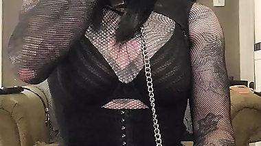 "Beautiful Goth Femboy In Hot Leather Lingerie Playing with Cock and Tight Asshole"