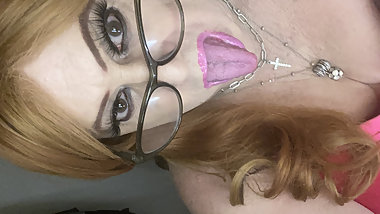 "CD Krissy Sweets 🍭 in lingerie and 8 inch high heels stroking her she cock"